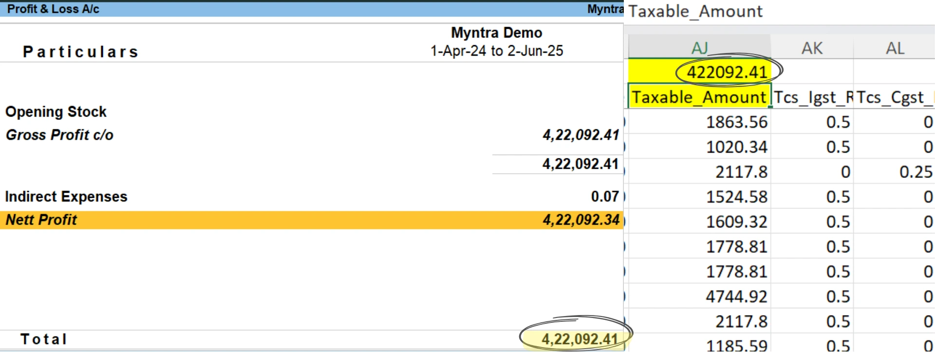 1. Open P&L a/c in Tally and check the Left-hand side total (Rs. 422,092.41 in the below example)